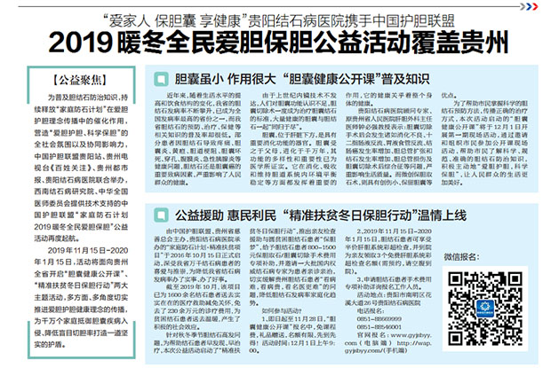 为普及胆结石防治知识,持续释放“家庭防石计划”在爱胆护胆理念传播中的催化作用,营造“爱胆护胆、科学保胆”的全社会氛围以及协同影响力,中国护胆联盟贵阳站、贵州电视台《百姓关注》、贵州都市报、贵阳结石病医院联合举办,西南结石病研究院、中华全国医师委员会提供技术支持的中国护胆联盟“家庭防石计划2019暖冬全民爱胆保胆”公益活动再度起航。